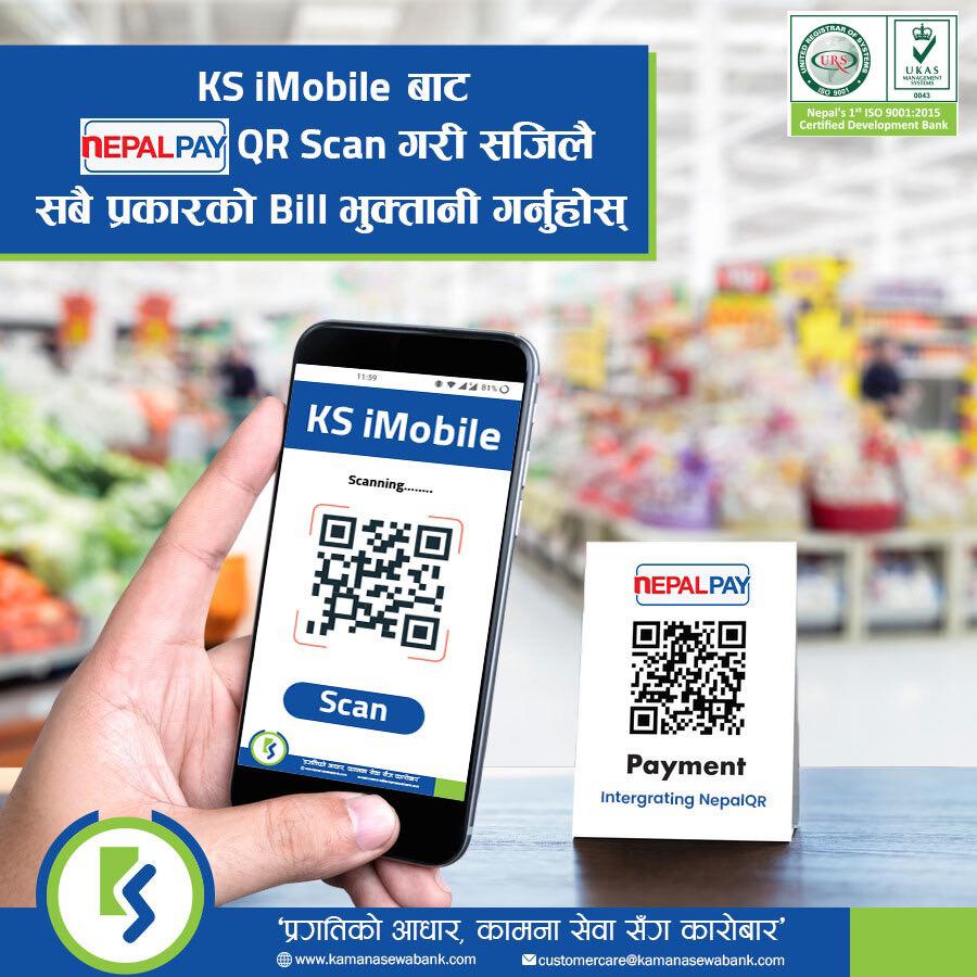 बैंकले असार ९ गते बिहीबारबाट Nepal Pay QR हरुलाई Merchant को KS iMobile बाट सीधै रकम भुक्तानी गर्नु मिल्ने गरी आफ्नो मोबाइल बैंकिङ QR Scanner गरेको छ ।