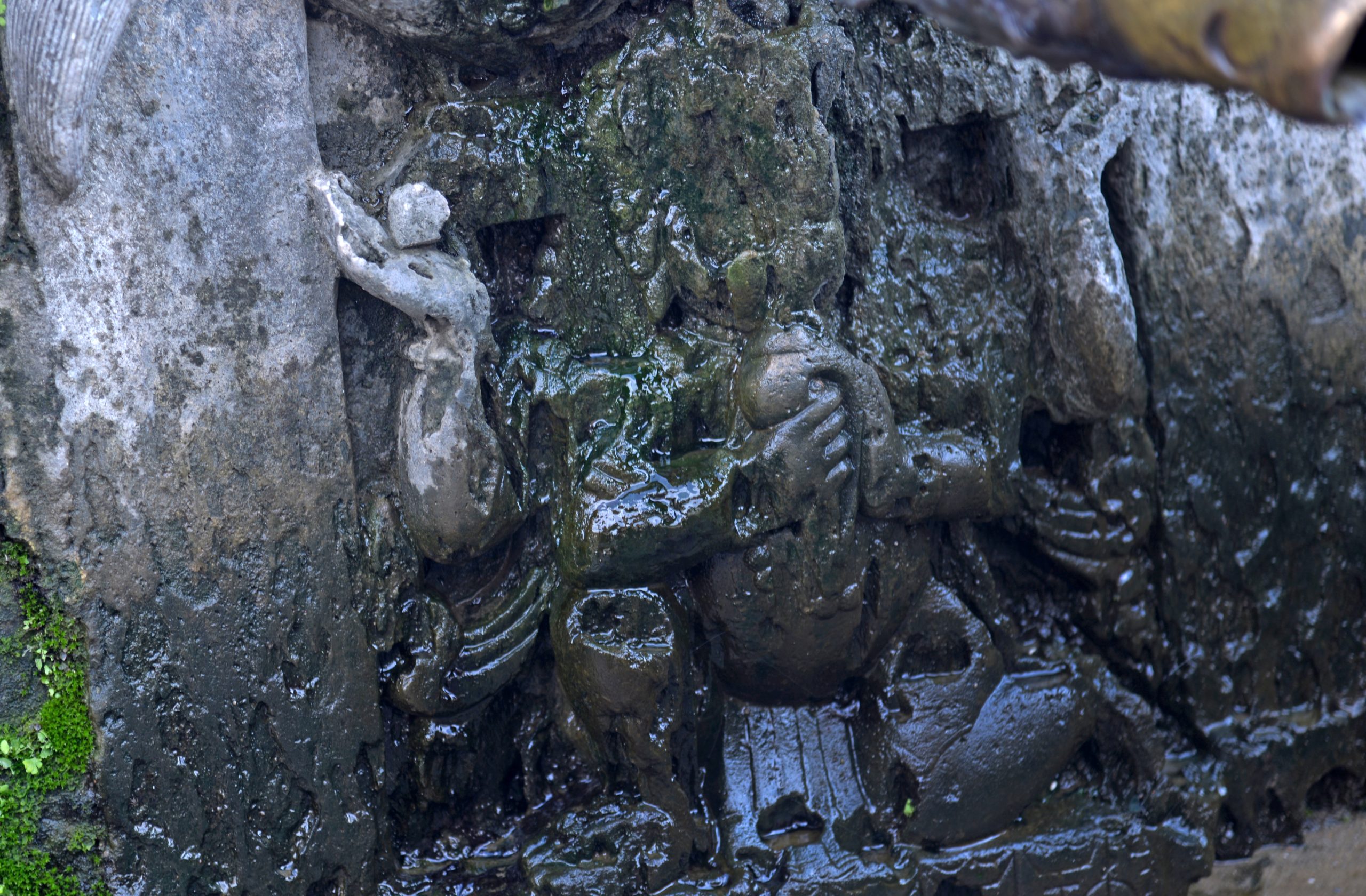 पाटन सुन्धारामा पानीले खिइएको मूर्ति ।