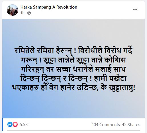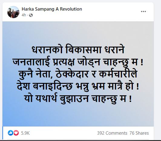 त्यसपछि पुनः आफूले धराने विकासमा धराने जनतालाई प्रत्यक्ष जोड्न चाहेको भन्दै कुनै नेता, ठेकेदार र कर्मचारीले देश बनाइदिन्छु भन्ने भ्रम मात्रै रहेको बताउँदै सामाजिक सञ्जालमा पोखिएका छन् ।
