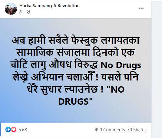 त्यसपछि पुनः सामाजिक सञ्जालमा दिनको एकपटक लागूऔषध विरुद्ध लेख्न सुसुचित गरेका छन् ।