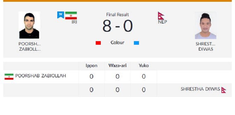 श्रेष्ठ पोरशाबसँग ८-० स्कोरले पराजित भए । अहिलेसम्मको एशियाडमा नेपाल पदक विहिन छ ।