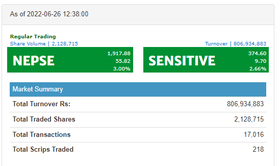 आइतबार यो समाचार तयार पार्दासम्म नेप्से ५५.८२ अंकले बढेर १९१७ दशमलव ८८ बिन्दुमा उक्लिएको छ । 12 बजेर ४० मिनेट जाँदा सेयर बजार ३ प्रतिशतले बढिसकेको छ । यस अवधिमा ८० करोड ७० लाखको कारोबार भइसकेको छ ।