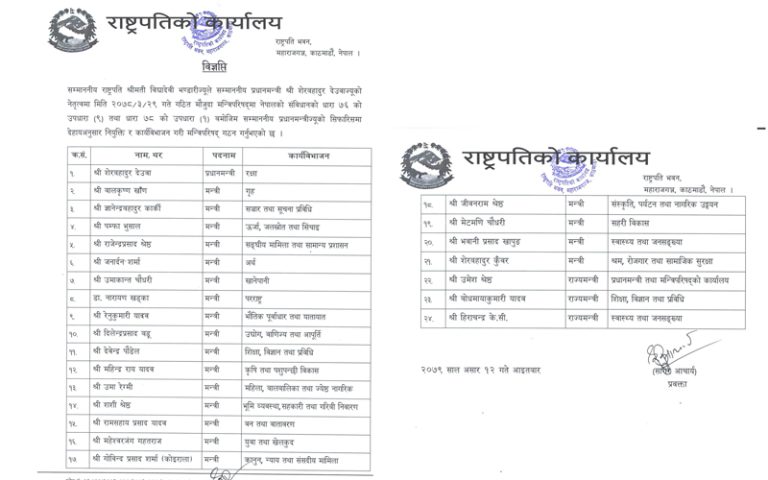 एकीकृत समाजवादीका मन्त्री हेरफेर, प्रधानमन्त्रीले गरे मन्त्रिपरिषद् पुनर्गठन