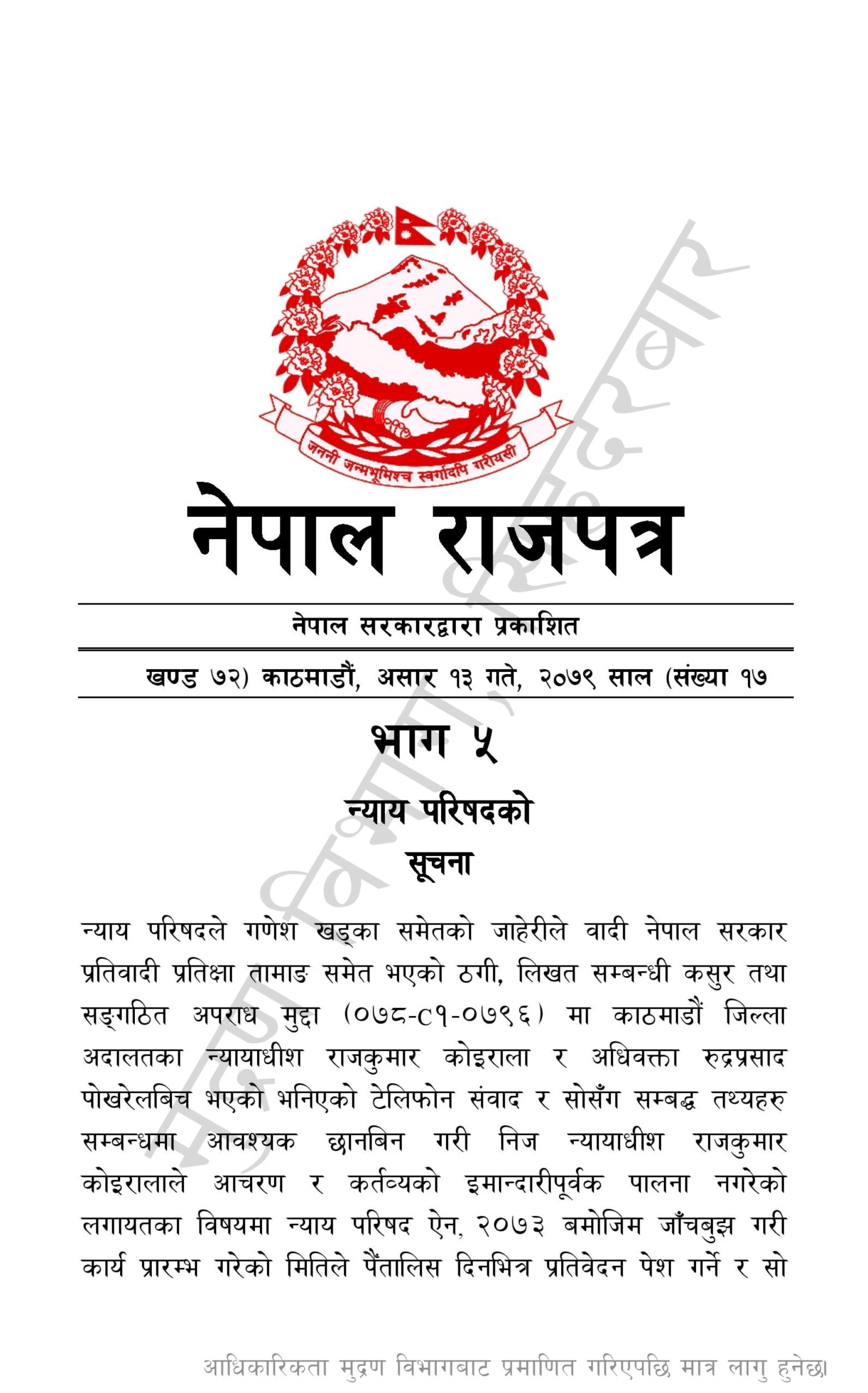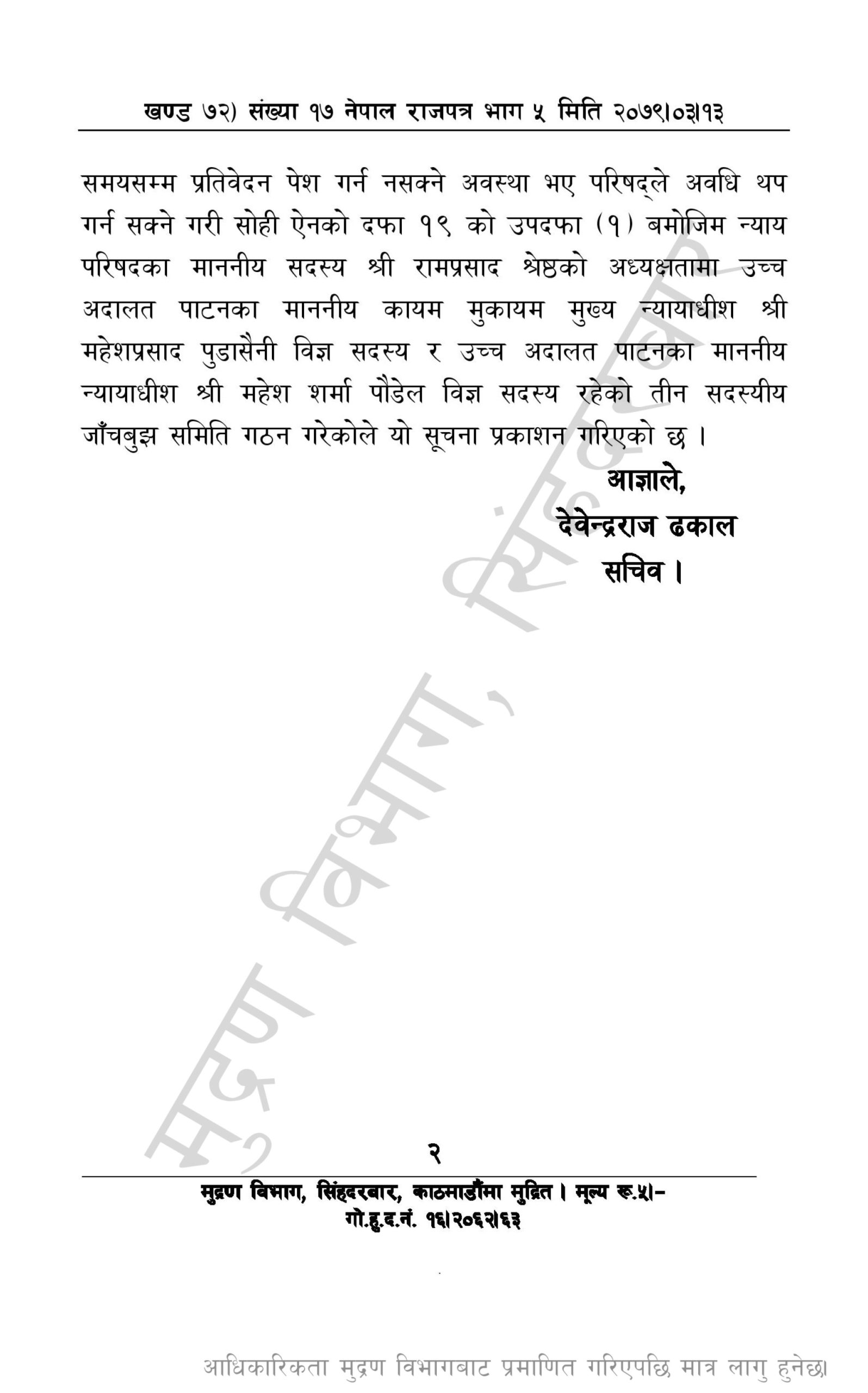 उक्त प्रकरण छानबिनका लागि जाँचबुझ समिति गठनबारेको सूचना नेपाल राजपत्रमा प्रकाशित भएसँगै उनी निलम्बित सोमबारबाट निलम्बनमा परेका हुन् ।