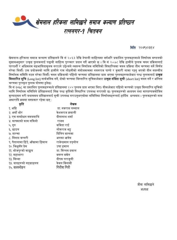 खेमलाल हरिकला लामिछाने समाज कल्याण प्रतिष्ठानले ०७८ मा प्रकाशित पुस्तकमध्ये प्रतिष्ठानलाई प्राप्त १४४ पुस्तकबाट पहिलो चरणमा १५ पुस्तक छनोट गरेको हो ।