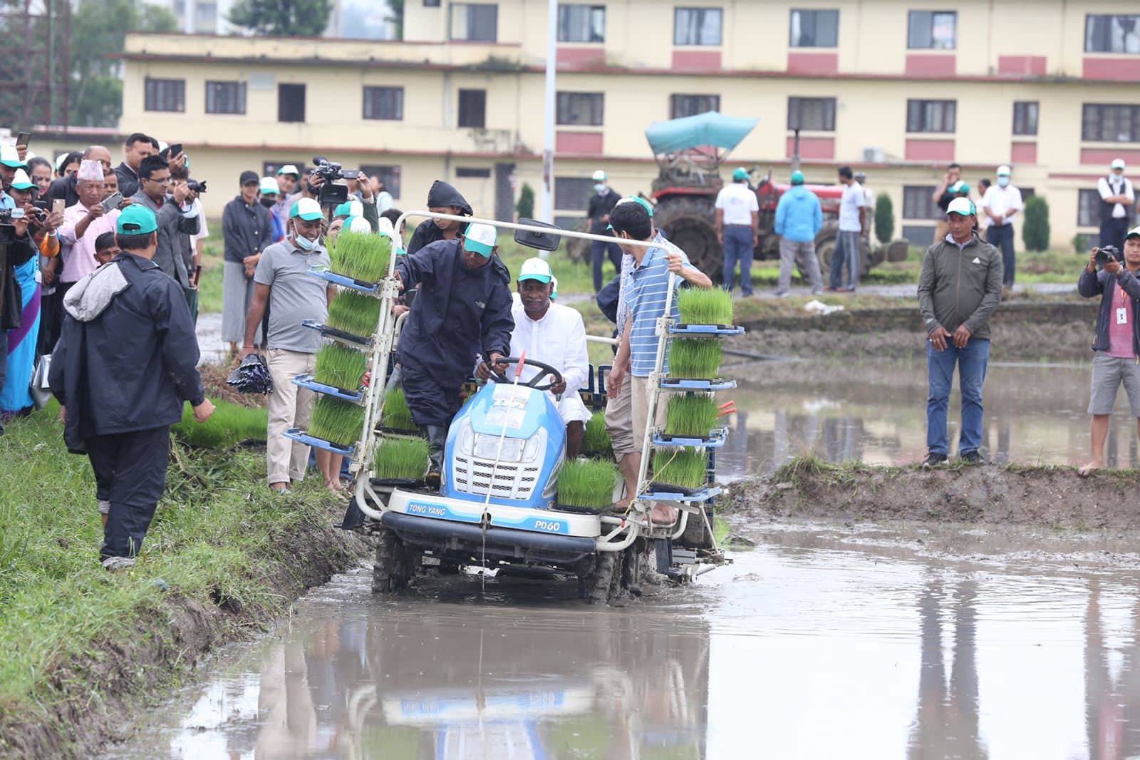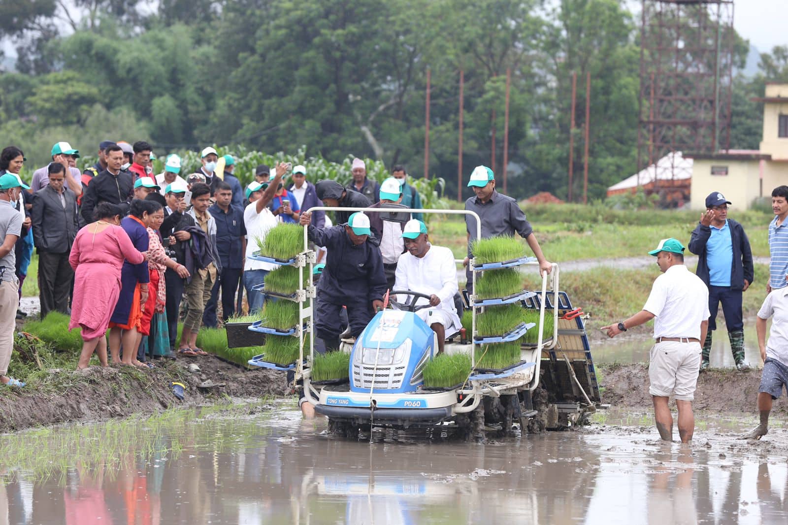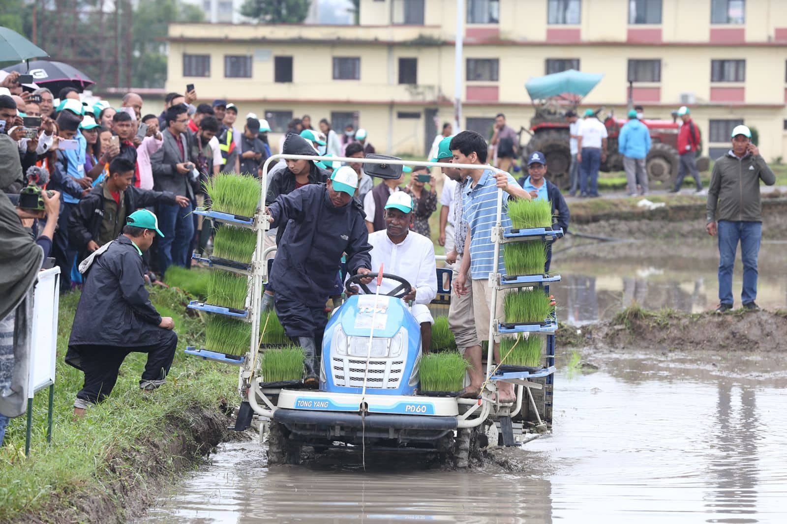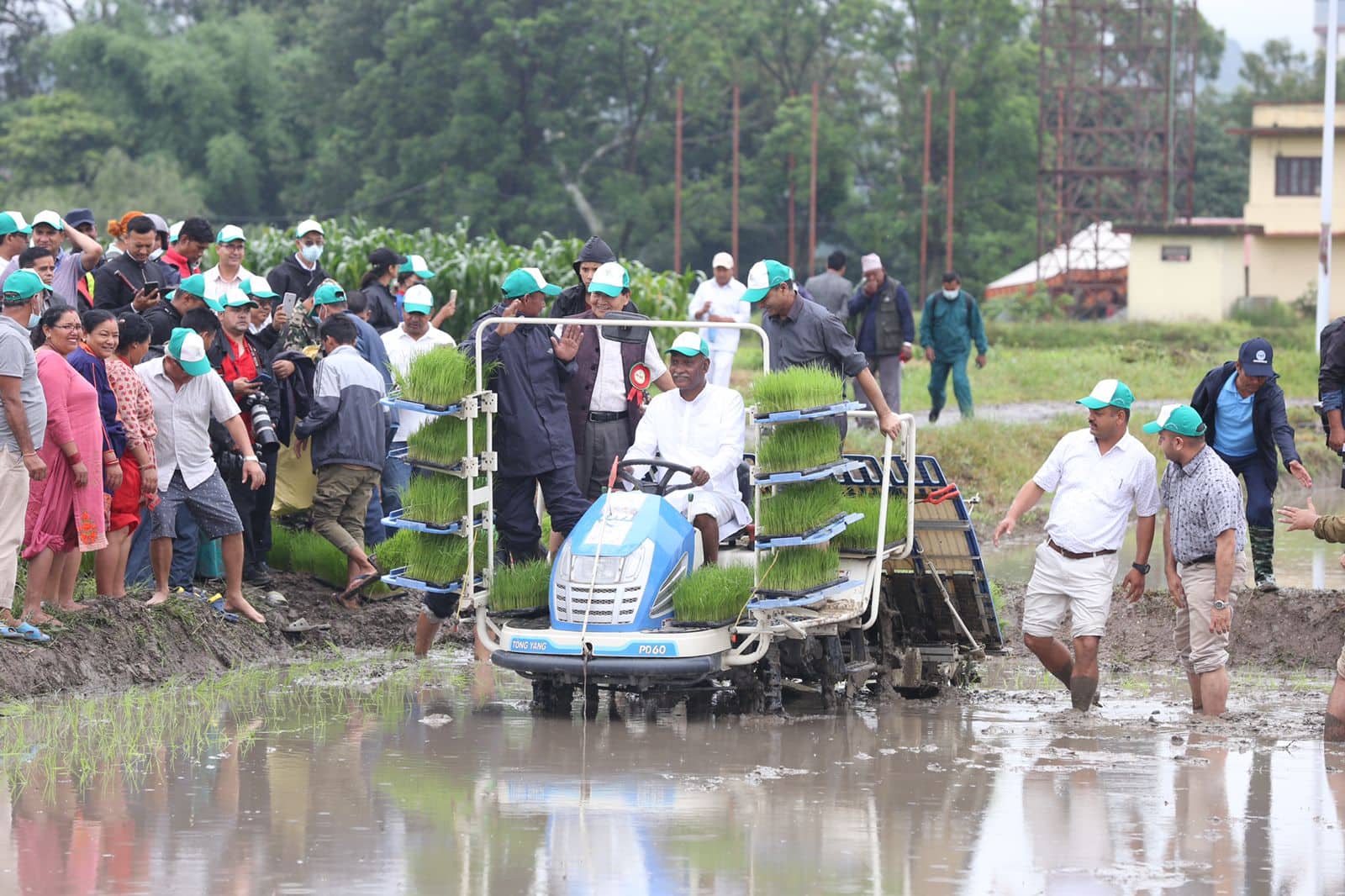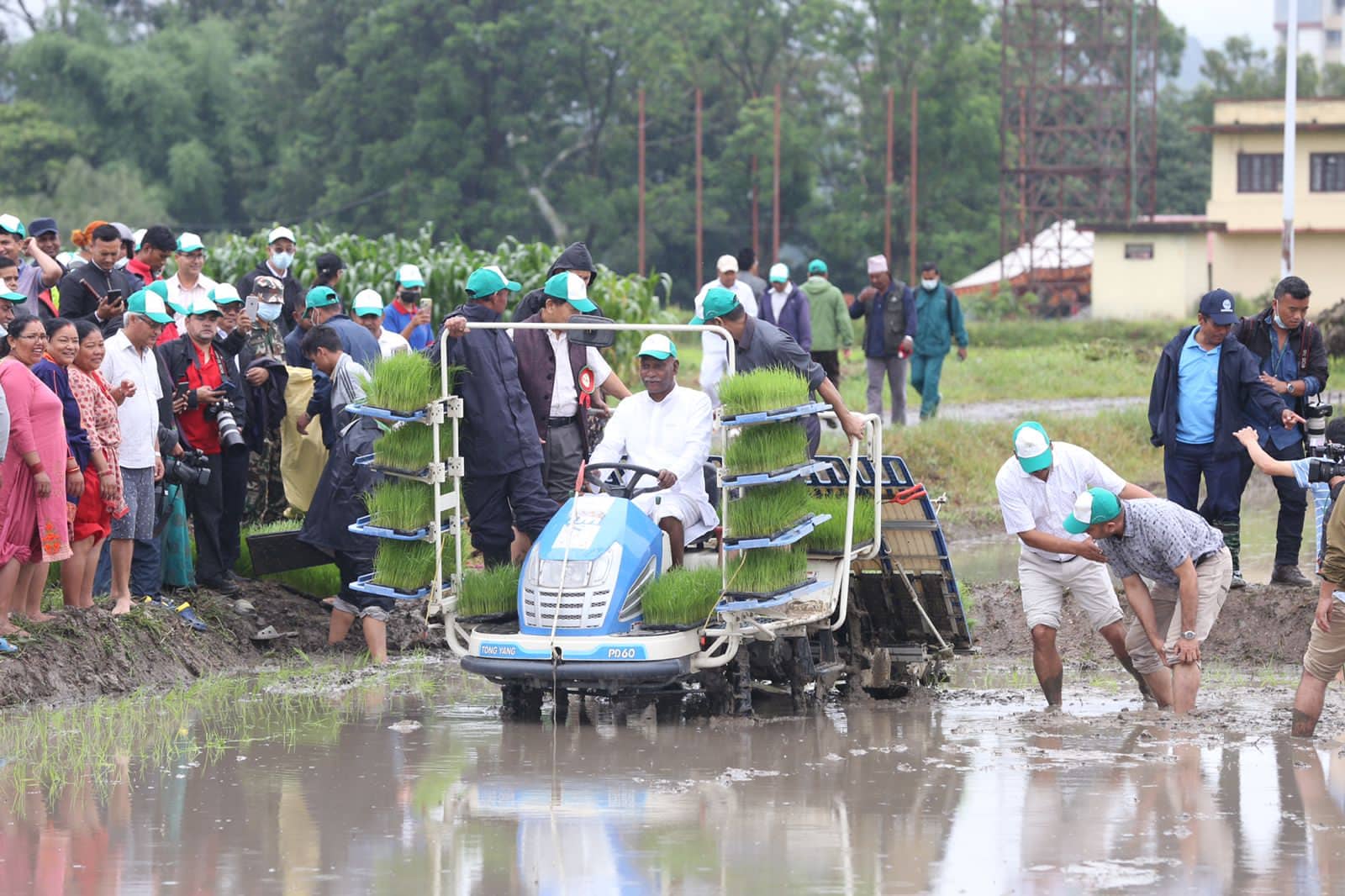 काठमाडौं । कृषि तथा पशुपंक्षी विकास मन्त्री महिन्द्र राय यादवले मेसिन चलाएर धान रोपेका छन् ।