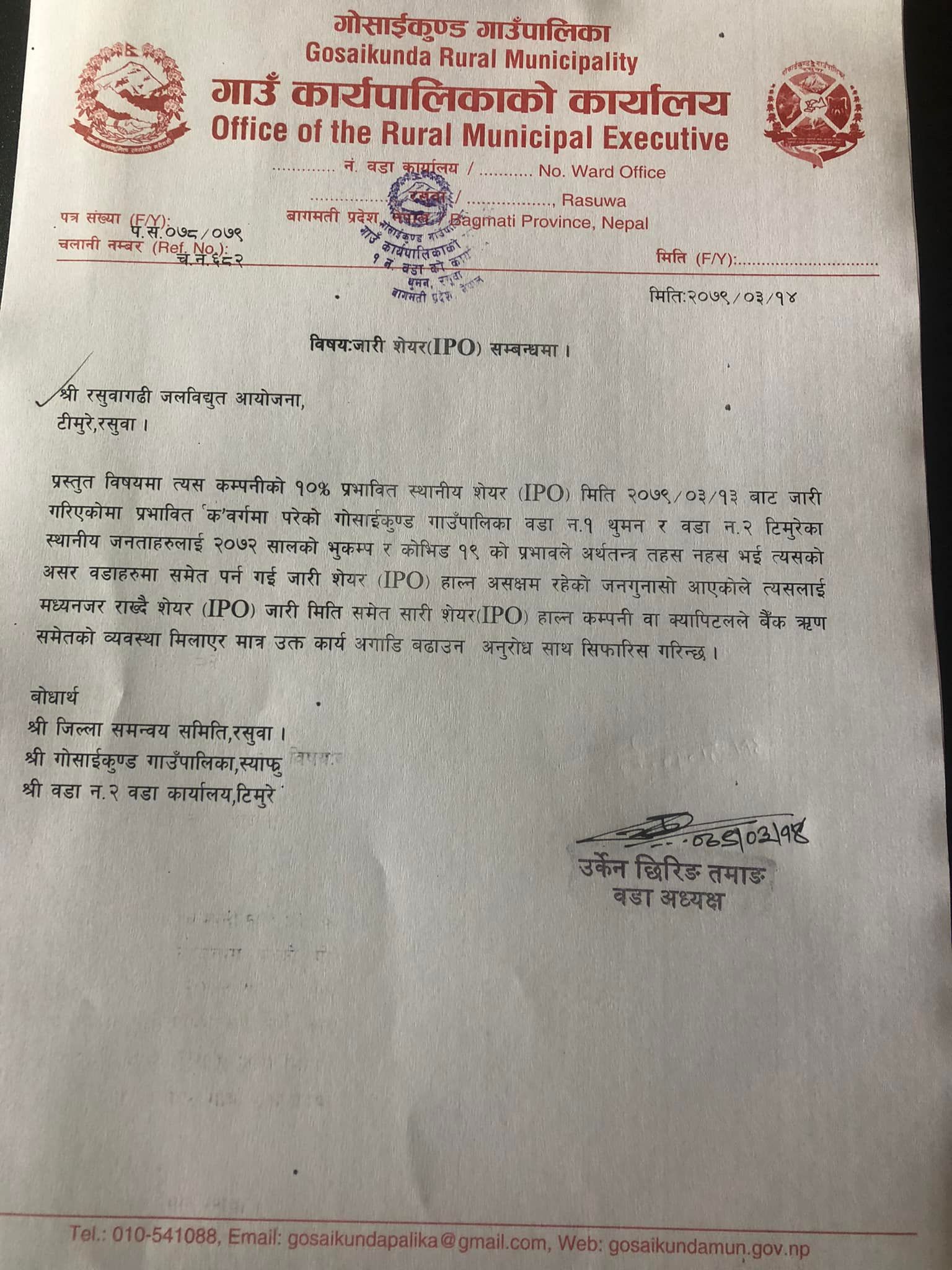 वडाध्यक्ष उर्केन छिरिङ तामाङले मंगलबार पत्रमार्फत आईपीओ निष्काशनको प्रक्रिया रोक्न माग गरेका हुन् । भूकम्प र कोरोना महामारीका कारण प्रभावित ‘क’ वर्गमा परेको वडा नम्बर १ थुमन र २ टिमुरेका स्थानीयवासी शेयर भर्न असक्षम रहेको उनले बताए । जारी मिति सारेर शेयर भर्नका लागि कम्पनी वा क्यापिटलले बैंकबाट ऋणको व्यवस्था मिलाउनुपर्ने समेत उनले बताए ।