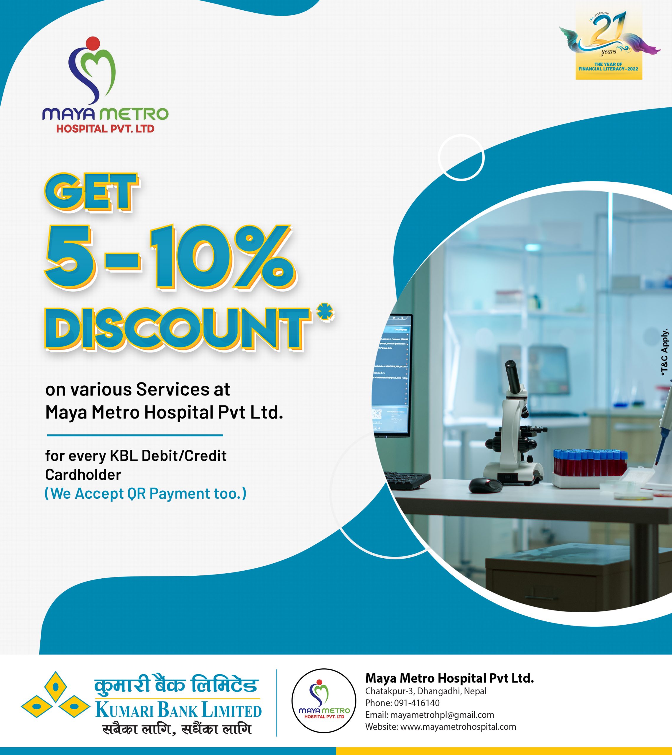 काठमाडौं । कुमारी बैंक लिमिटेड र धनगढी, कैलालीस्थित माया मेट्रो अस्पतालबीच कुमारी बैंक लिमिटेडका ग्राहकहरुलाई माया मेट्रो अस्पतालबाट प्रदान गरिने स्वस्थोउपचार सम्बन्धी सेवाहरुमा विशेष छुट प्रदान गर्ने समझदारी भएको छ ।