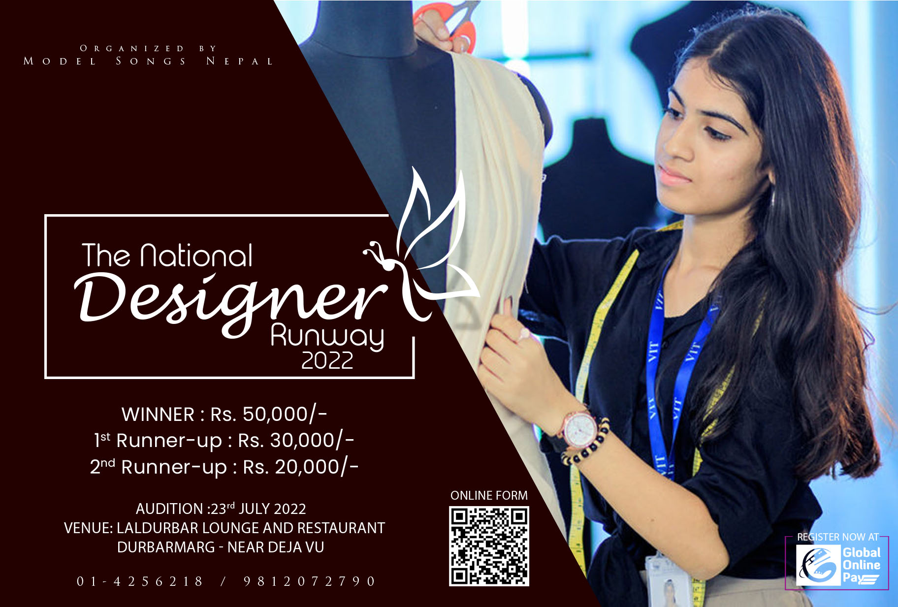 काठमाडौं । मोडल सङ्स नेपालले नेपालमै पहिलोपटक राष्ट्रियस्तरको फेशन डिजाइनर लक्षित ‘द नेशनल डिजाइनर रनवे’ आयोजना गर्ने भएको छ । आयोजकले बिहीबार एक विज्ञप्ती जारी गर्दै ‘द नेशनल डिजाईनर रनवे’ को आवेदन फारम खुला भएको जानकारी दिएको छ ।