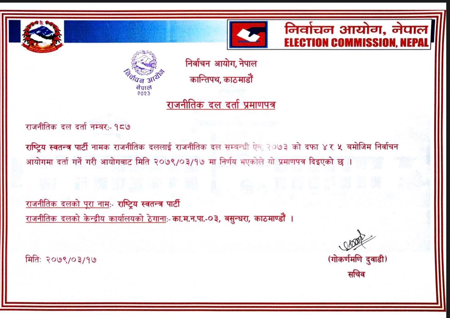 चुनावचिन्ह घण्टीसहित राष्ट्रिय स्वतन्त्र पार्टी आज निर्वाचन आयोगमा दर्ता भएको हो । दर्ता पश्चात दललाई आयोगले शुक्रबार दल दर्ताको प्रमाणपत्र दिएको छ ।