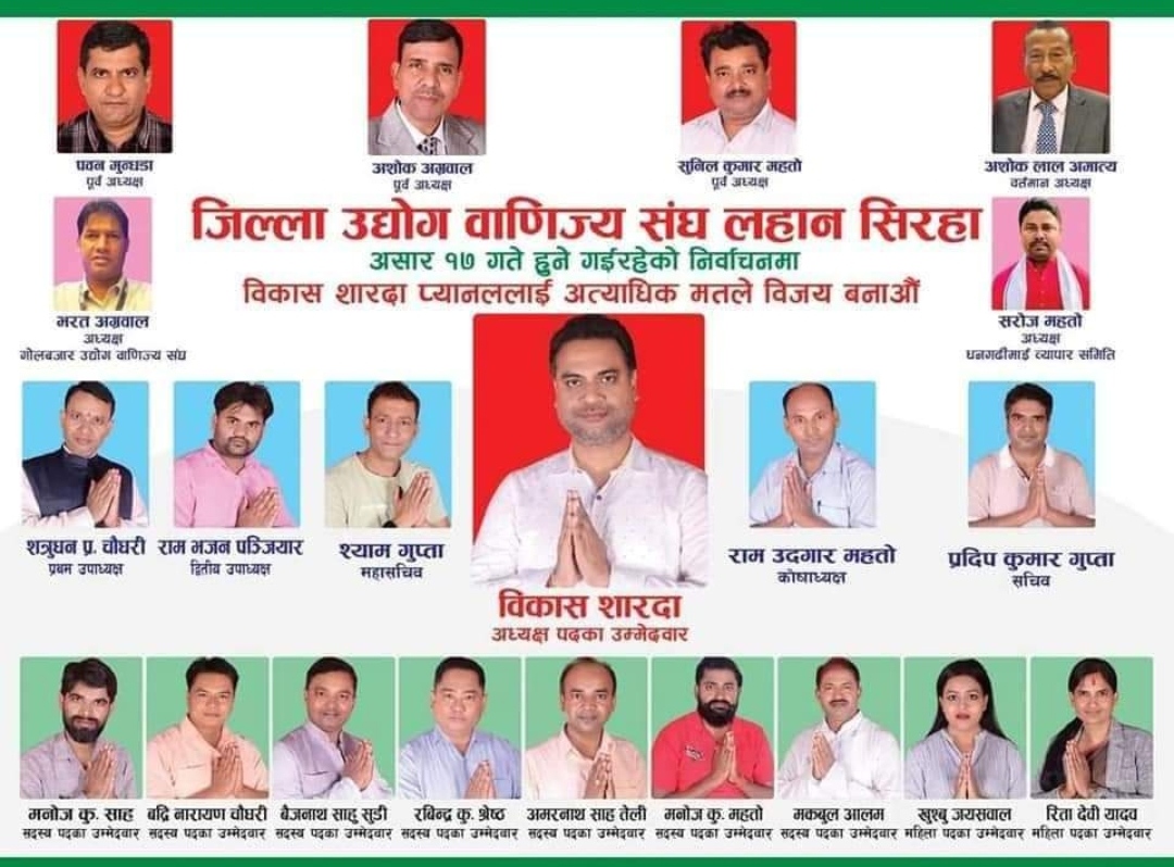 सिरहा । जिल्ला उद्योग वाणिज्य संघ सिरहाको ३३ औँ नगरसभाद्वारा आयोजित निर्वाचनबाट अध्यक्ष पदमा विकास शारडाको प्यानल विजयी भएको छ। निकटतम प्रतिस्पर्धी पशुति साहभन्दा २२६ मत बढी प्राप्त गर्दै सारडा प्यानलसहित विजयी भएका हुन्।