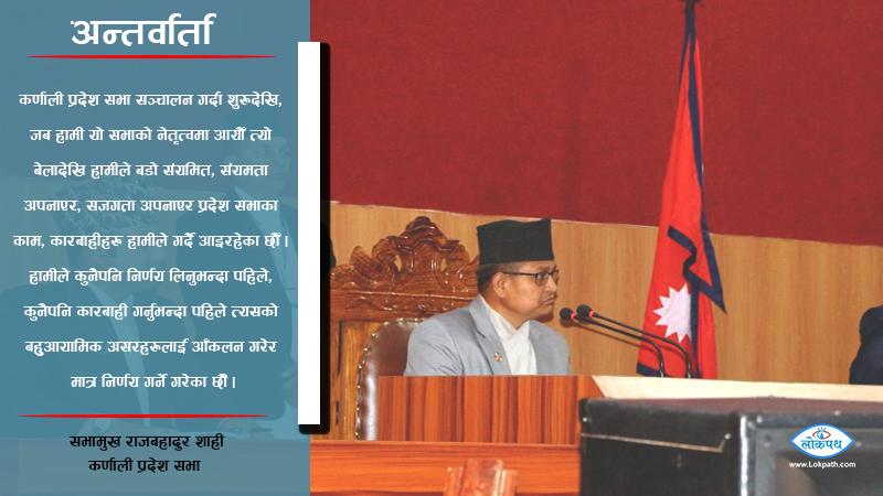 निश्चयपनि संस्थागत अनुभव नहुँदा हामीले नयाँ–नयाँ खालका परिस्थितिहरुको सामना गर्नुपर्यो । कर्णाली प्रदेश सभा सञ्चालन गर्दा शुरुदेखि, जब हामी यो सभाको नेतृत्वमा आयौँ त्यो बेलादेखि हामीले बडो संयमित, संयमता अपनाएर, सजगता अपनाएर प्रदेश सभाका काम, कारबाहीहरु हामीले गर्दै आइरहेका छौँ । हामीले कुनैपनि निर्णय लिनुभन्दा पहिले, कुनैपनि कारबाही गर्नुभन्दा पहिले त्यसको बहुआयामिक असरहरुलाई आँकलन गरेर हामीले निर्णय गर्छौं । हाम्रा परम्पराहरु, अन्तर्राष्ट्रिय परम्परा, राष्ट्रिय परम्परा, संसदीय व्यवस्थालाई अगाडी बढ्ने क्रममा स्थापित भएका परम्पराहरु के छन् त्यस विषयमा जानकारी लिएर हामीले निर्णय गर्दै आएका छौँ । त्यसो हुँदा हामीले धेरै ठूलो समस्या झेल्नुपरेको छैन ।