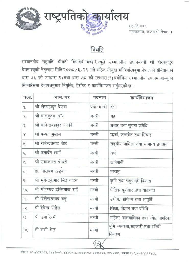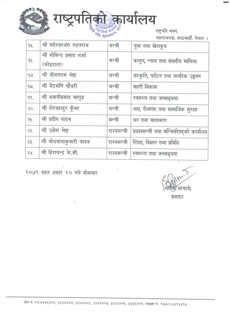 प्रधानमन्त्रीले गरे मन्त्रिमण्डल हेरफेर, जसपाका ३ नयाँ तीन मन्त्री (पत्रसहित)