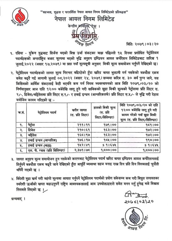 पेट्रोल प्रतिलिटर २ तथा डिजेल र मट्टितेलमा ९ रुपैयाँले वृद्धि भएकाे हो । त्यस्तै निगमले हवाई इन्धन आन्तरिकतर्फ प्रतिलिटर ५ रुपैयाँ वृद्धि गरेको छ ।