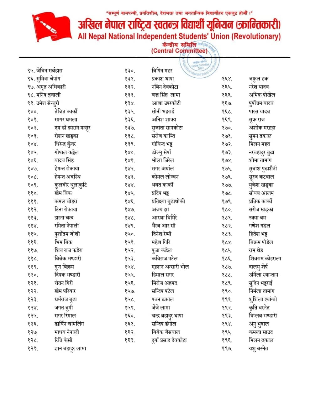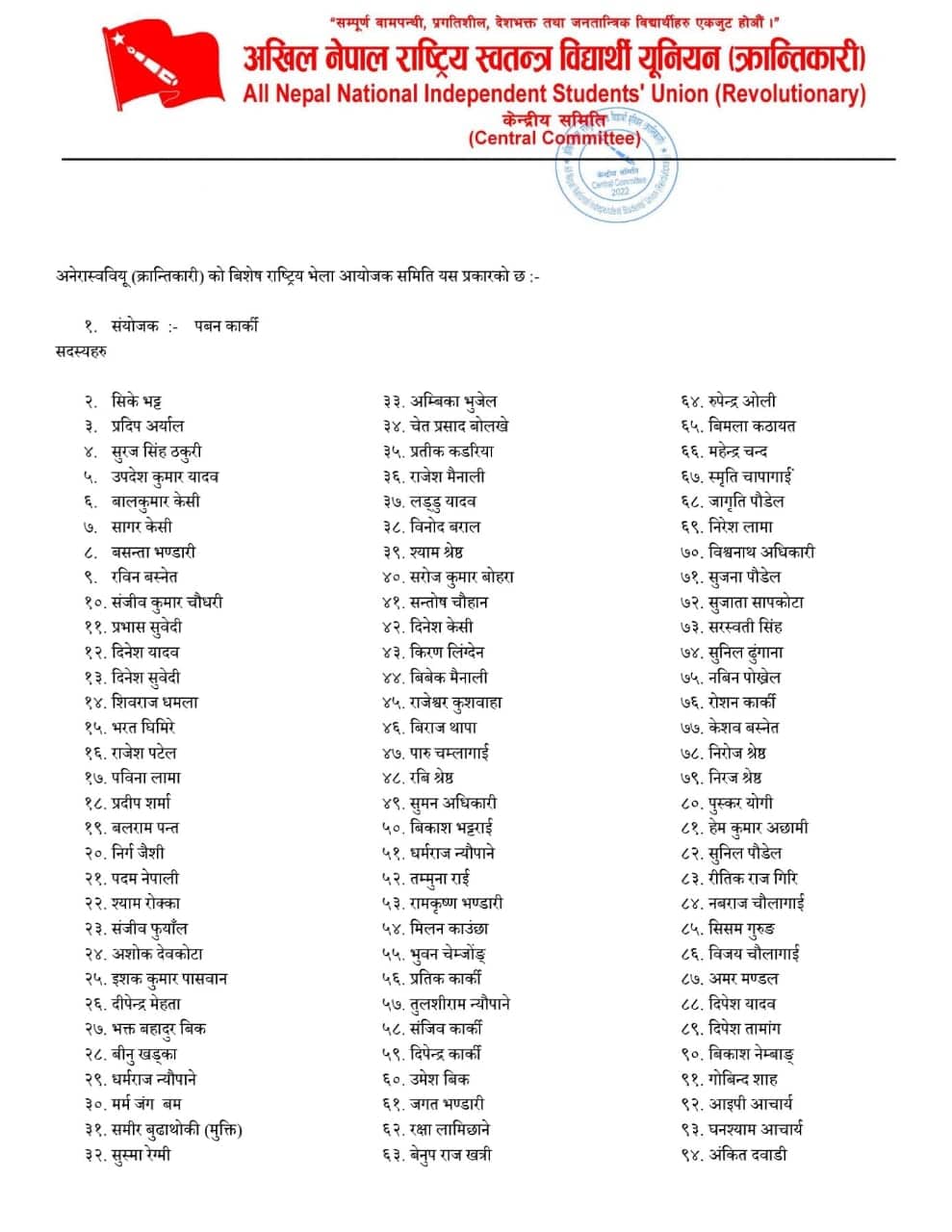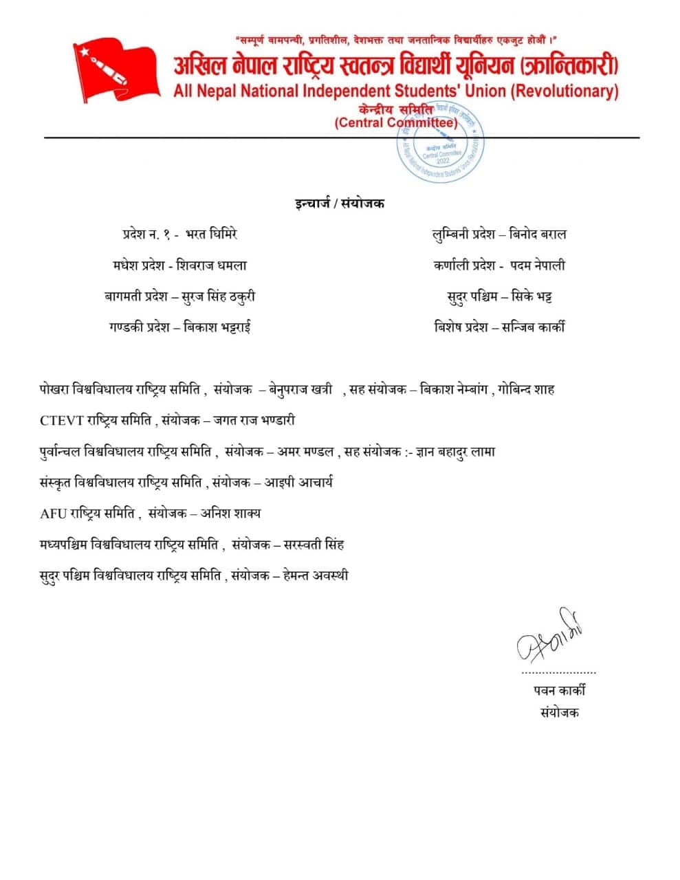 काठमाडौं । प्रज्ञा भवनमा नेकपा माओवादीको केन्द्रीय कमिटीको पूर्ण बैठक चलिरहँदा सोही पार्टीको भातृ संगठन अखिल क्रान्तिकारीका उपाध्यक्ष पवन कार्की समूहले भने समानान्तर समितिलाई पुर्णता दिएको छ ।