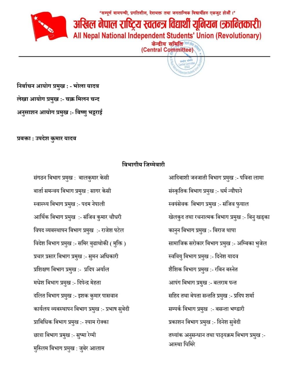 सो समूहका उपदेश यादवका अनुसार झन्डै २ दर्जन केन्द्रीय विभागमा पनि इन्चार्ज र सह–इन्चार्ज तोकिएका छन्। आगामी बैठकले राष्ट्रिय सम्मेलनको मिति तय गर्ने यादवले जानकारी दिएका छन्।