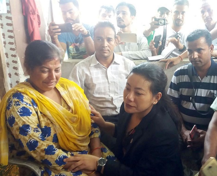 उनीसँगै निर्मलाका परिवार भेट्न पुगेका प्रतिनिधिसभा सदस्य नीरु पालका पनि आँखा रसाइरहेका थिए । प्रतिनिधिसभा सदस्य पालले निर्मलाका आमालाई सहानुभूति व्यक्त गर्दै सबै मिलेर हत्यारालाई कारवाहीको दायरामा ल्याउने बचन दिए ।