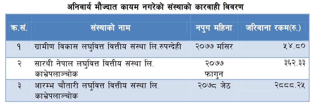 यसैगरी, सारथी लघुवित्त वित्तीय संस्था काभ्रेपलाञ्चोकलाई पनि २०७७ फागुन महिनामा अनिवार्य नगद मौज्दात कायम नगरेको आधारमा तीन सय ६२ रुपैयाँ ३३ पैसा नगद जरिवाना तिराइएको छ ।