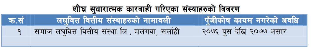 समाज लघुवित्त वित्तीय संस्था सर्लाहीलाई भने २०७६ पुस देखि २०७७ असार मसान्तसम्म पुंजीकोष कायम नगरेको आधारमा सिघ्र सुधारात्मक कारवाही गरिएको राष्ट्र बैंकको भनाइ छ ।