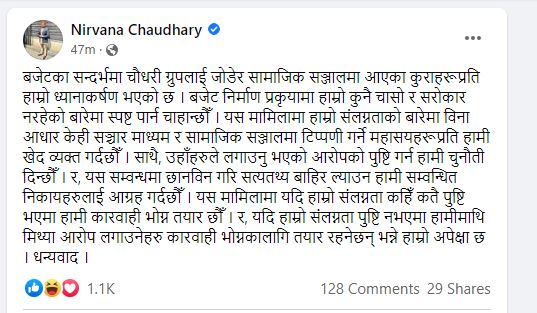 सामाजिक सञ्जालमा लेख्दै चौधरीले आफूहरुको कुनै पनि संलग्नता नभएको भन्दै सत्यतथ्य छानबिन गर्न सम्बन्धित निकायको ध्यानाकर्षण समेत गराएका छन् । उनले आफूहरुलाई बजेट निर्माण कुनै चासोको विषय नभएको प्रष्ट पार्दै सो प्रकरणमा आफूहरुलाई आरोप लगाएको भन्दै गल्ती पुष्टि भएमा कारबाही भोग्न तयार रहेको समेत स्पष्ट पारेका छन् ।