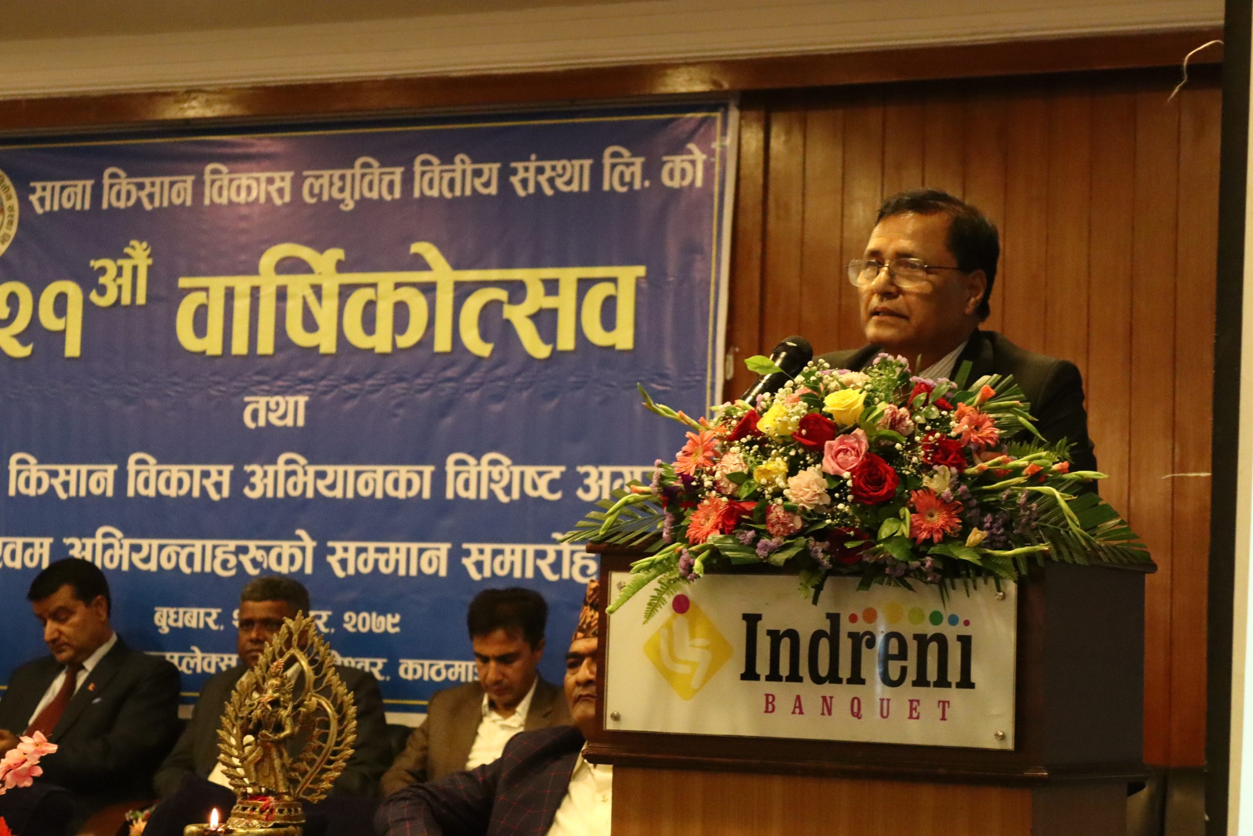 कार्यक्रममा साना किसान विकास लघुवित्त वित्तीय संस्था लि. का अध्यक्ष खेम बहादुर पाठकले नेपालका दुरदराजका गरिब किसानहरुको जीवन रुपान्तरणमा विगत २१ वर्षदेखी निरन्तर काम गर्दै आएको बताए । ग्रामिण क्षेत्रमा साना किसानहरुले भोगिरहेको आर्थिक समस्यालाई निधान गर्ने एक मात्र संस्था साना किसान विकास लघुवित्त वित्तीय संस्था भएको दाबी गरे ।