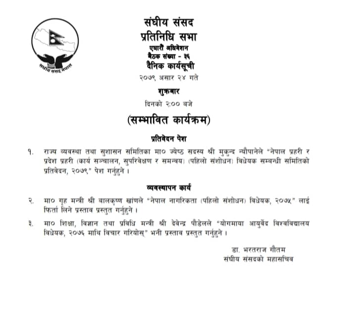 जसमा शिक्षामन्त्रीले योगमाया आयुर्वेद विश्वविद्यालय विधेयक, २०७६ माथि विचार गरियोस् भन्ने भन्ने प्रस्ताव प्रस्तुत गर्ने, राज्यव्यवस्था तथा सुशासन समितिका जेष्ठ सदस्य मुकुन्द न्यौपानेले नेपाल प्रहरी र प्रदेश प्रहरी विधेयक सम्बन्धि समितिको प्रतिवेदन २०७९ पेश गर्ने कार्यसूची रहेको छ ।