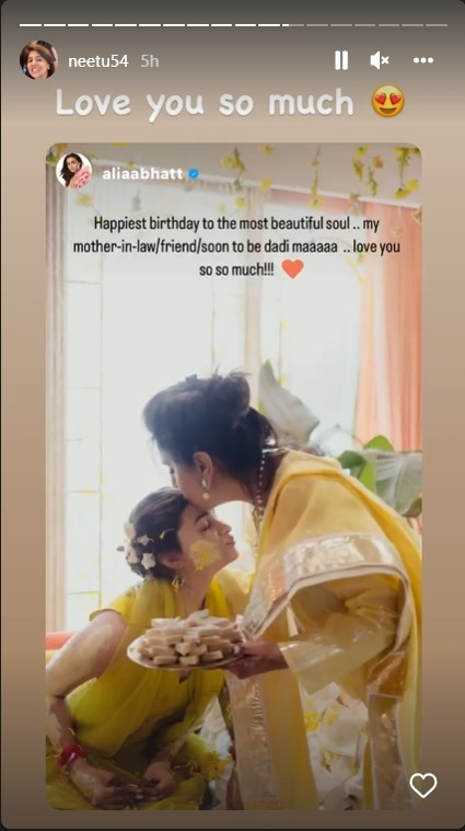 अभिनेत्रीले आफ्नी सासू नीतु कपूरसँगको निकै प्यारो तस्बिर सेयर गरेकी छिन्, जसमा दुवैबीच आमा छोरीको माया देख्न सकिन्छ । यससँगै आलियाले एउटा क्यूट नोट पनि लेखेकी छिन् ।