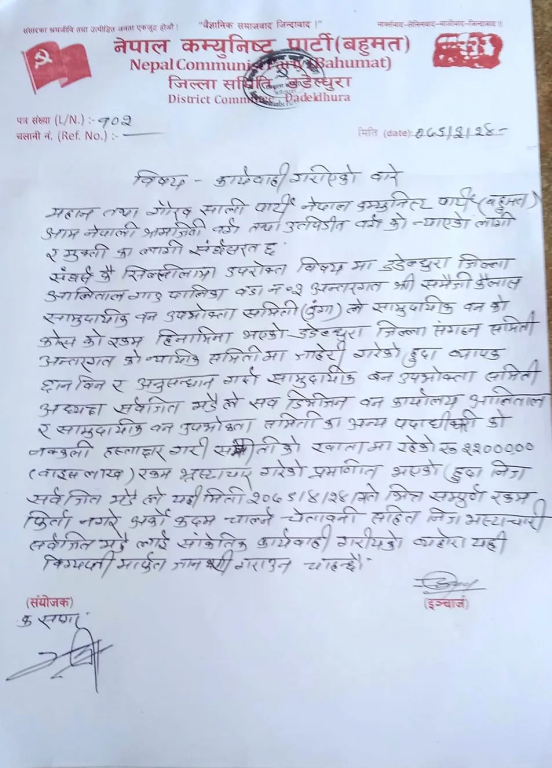 सामुदायिक वन उपभोक्ता समितिका अन्य पदाधिकारीको नक्ली हस्ताक्षर गरी वनका अध्यक्ष मडैले रकम हिनामिना गरेको भन्दै बाँस्तोला नेतृत्वको नेकपा बहुमतका कार्यकर्ताले सांकेतिक कारबाही गरिएको जनाएको छ ।