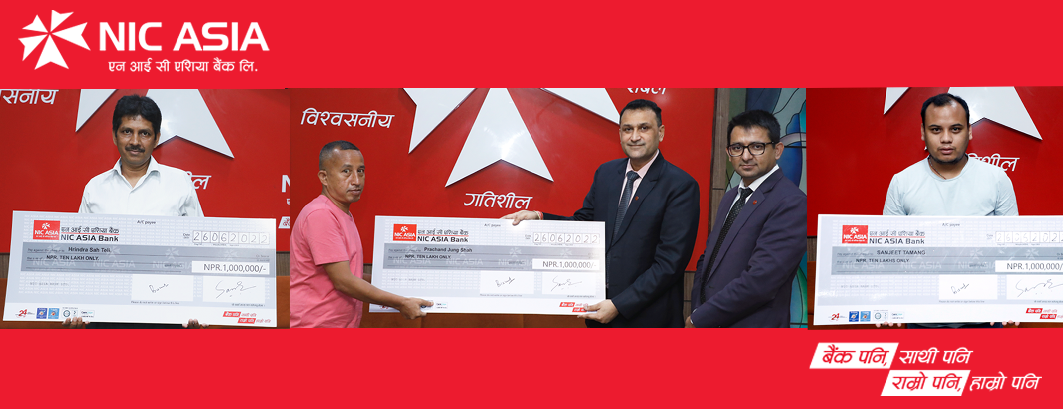 बीमा लाभ प्राप्त गर्नेमा बैंकको स्वयम्भु शाखामा सर्वश्रेष्ठ बचत खाता ‘एम्बेसडर’ श्रेणीको खाता खोलेका हरिन्द्र शाह तेली, जाजरकोट शाखामा सर्वश्रेष्ठ बचत खाता ‘एम्बेसडर’ श्रेणीको खाता खोलेका प्रचण्ड जंग शाह र थली शाखामा सर्वश्रेष्ठ कागेश्वरी मनोहरा नगरपालिका बचत खाता ‘एम्बेसडर’ श्रेणीको खाता खोलेका सञ्जित तामाङ रहेका छन् ।