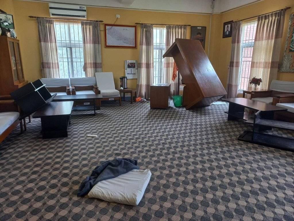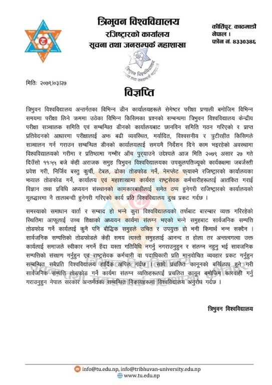 विश्वविद्यालयले जारी गरेको विज्ञप्तिमा ती समूहका मानिसहरूले कार्यकक्षमा जबर्जस्ती प्रवेश गरी कुर्सी, टेबल, ढोका इत्यादि तोडफोड गरेको जनाइएको छ।