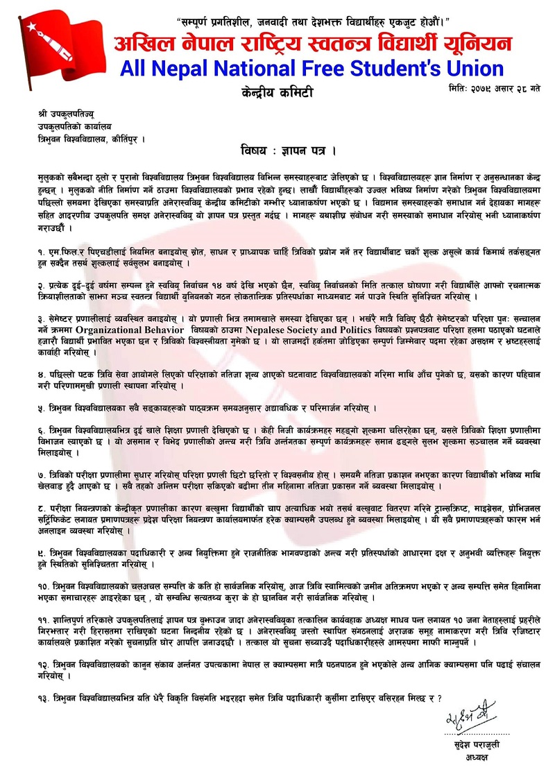 त्रिविमा पछिल्लो समय देखिरहेको समस्याहरुको तत्काल निराकरणसहित विभिन्न १३ बुँदे माग अनेरास्ववियूको रहेको छ ।