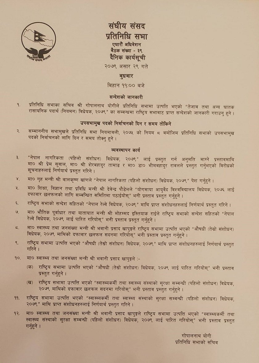 काठमाडौं । झण्डै चार वर्षदेखि रिक्त रहेको प्रतिनिधिसभाको उपसभामुख चयनका लागि मिति तोकिने भएको छ । प्रतिनिधि सभाको आज (बुधबार) बस्ने बैठकमा सभामुख अग्नि सापकोटाले प्रतिनिधि सभाको उपसभामुख पदको निर्वाचनका लागि दिन र समय तोक्ने कार्यसूची रहेको छ ।