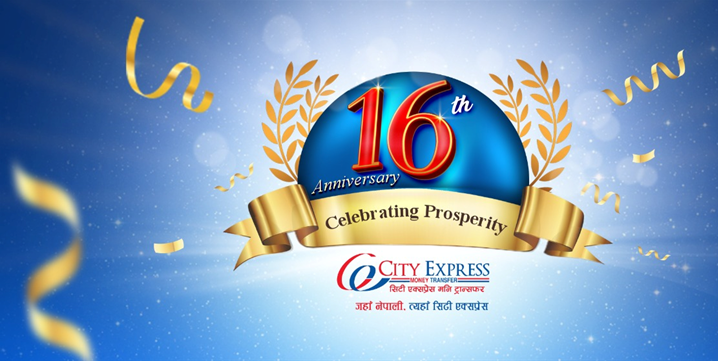 काठमाडौं । सिटी एक्सप्रेस मनी ट्रान्सफरले असार २७ गते १६औँ वर्षमा प्रवेश गरेको छ । सिटी एक्सप्रेस मनी ट्रान्सफरले “समृद्धीको उत्सव” भन्ने मुल नाराका साथ १६औँ वार्षिकोत्सवको अवसरमा १६ वर्षसम्मको निरन्तर यात्रामा सहयात्री भई साथ दिने ग्राहक, शुभचिन्तक, नियामक निकाय एवं साझेदार संस्थाहरुमा हार्दिक धन्यवाद व्यक्त गरेको छ ।