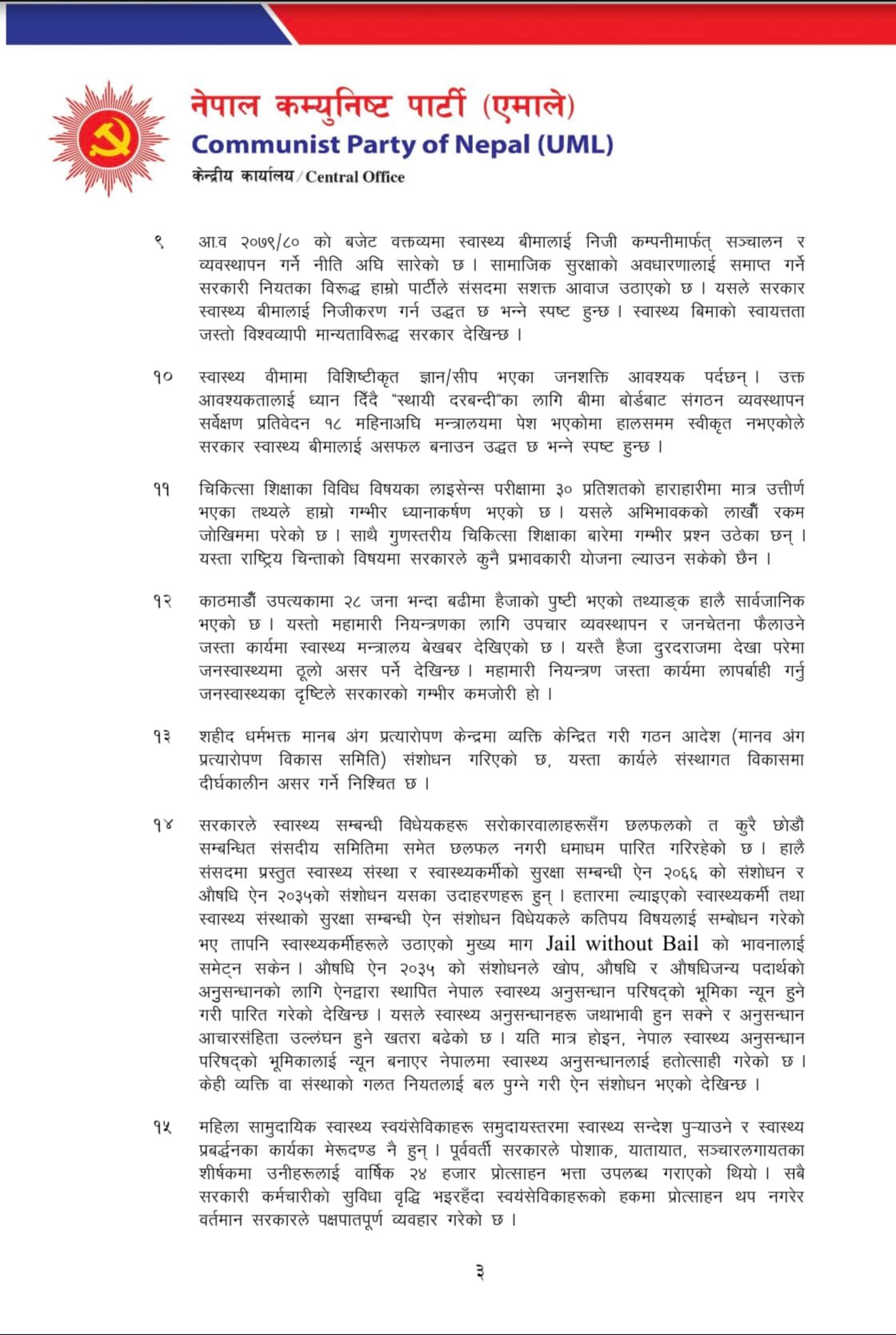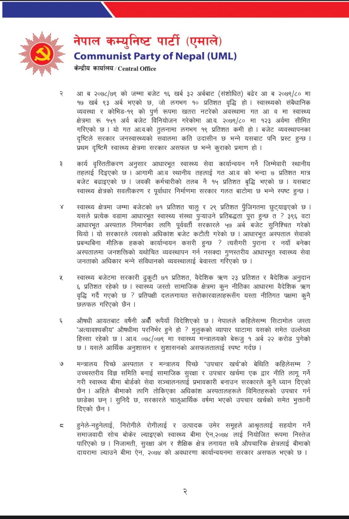 एमालेले स्वास्थ्य क्षेत्रमा सरकार प्रथम दृष्टिमै असफल भएको जनाएको छ । ‘गत आ।व।मा स्वास्थ्य क्षेत्रमा रु। १५१ अर्ब बजेट विनियोजन गरेकोमा आ.व. २०७९/८० मा १२३ अर्बमा सीमित गरिएको छ । यो गत आ।व।को तुलनामा लगभग १९ प्रतिशत कमी हो । बजेट व्यवस्थापनका दृष्टिले सरकार जनस्वास्थ्यको सवालमा कति उदासीन छ भन्ने यसबाट पनि प्रस्ट हुन्छ । प्रथम दृष्टिमै स्वास्थ्य क्षेत्रमा सरकार असफल छ भन्ने कुराको प्रमाण हो,’ विज्ञप्तिमा भनिएको छ ।