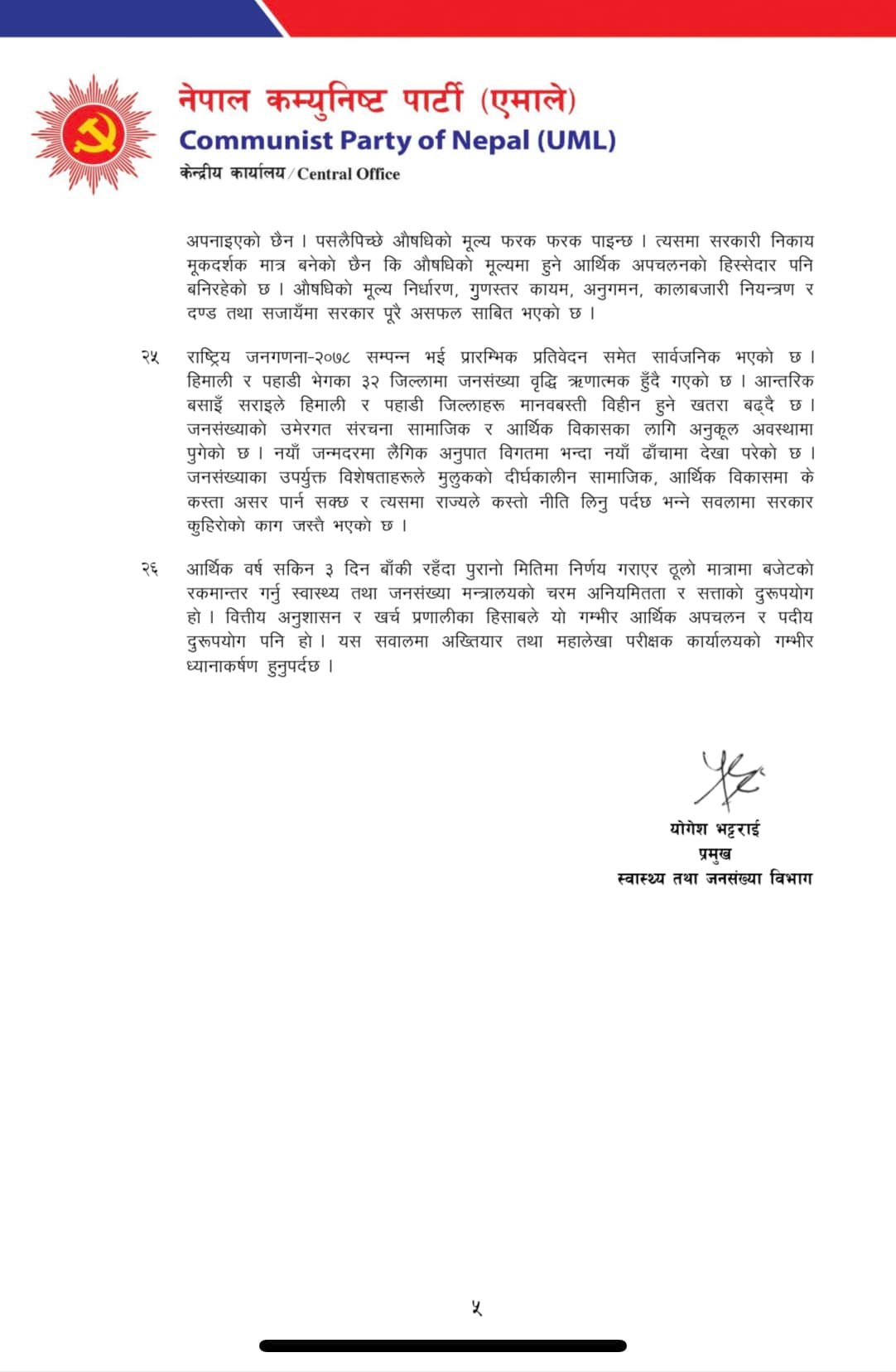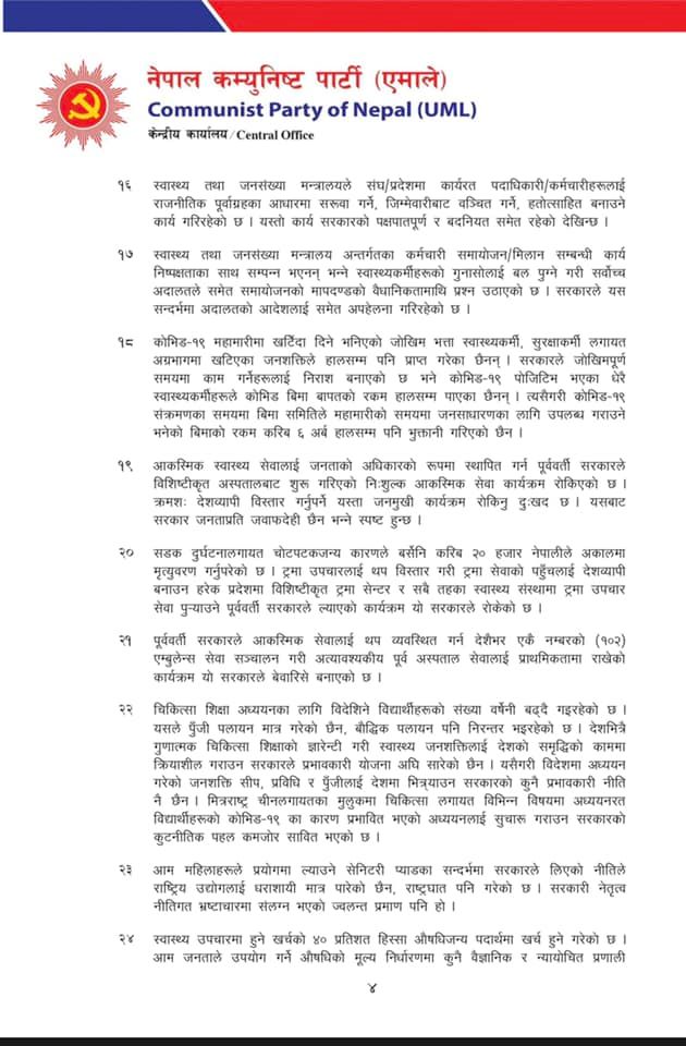 एमाले स्वास्थ्य तथा जनसंख्या बिभागले शुक्रबार पार्टी केन्द्रीय कार्यालयमा पत्रकार सम्मेलन गरी सचिवसमेत रहेका विभाग प्रमुख योगेश भट्टराईले २६ बुँदामा सरकारको विरोध गरेको हो । उनले सरकारको असक्षमताका कारण कोभिडको १० लाख डोज खेर गएको र अब चाँडै २० लाख खोप म्याद सकिएर फाल्नुपर्ने अवस्थामा पुगेको दाबी गरेका छन् ।