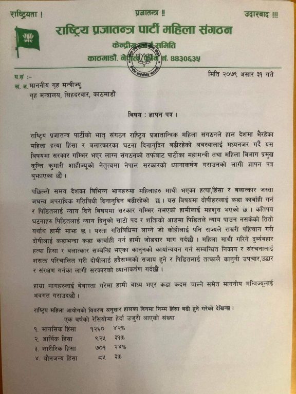 संगठनकी अध्यक्ष अञ्जना शाह रावलको नेतृत्वमा गएको प्रतिनिधिमण्डलले गृहमन्त्री खाँडलाई ज्ञापनपत्र बुझाएको हो । सो अवसरमा पार्टीकी महामन्त्री कुन्ती कुमारी शाहीको पनि उपस्थिति थियो ।