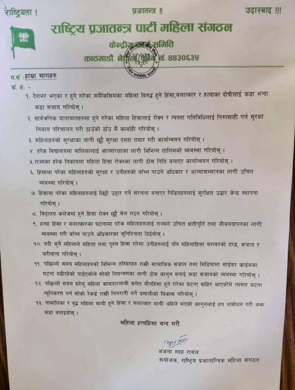 यसक्रममा महिला संगठन पनि आफ्नो सरोकारका विषयलाई लिएर आन्दोलित भएको हो । १ असारमा २ सुत्रीय माग रोखेर प्रधानमन्त्रीलाई ज्ञापनपत्र बुझाएको राप्रपाले आफ्ना मागहरू पूरा गराउन सरकारलाई दबाब सिर्जना गर्न निरन्तर आन्दोलनमा होमिएको हो ।