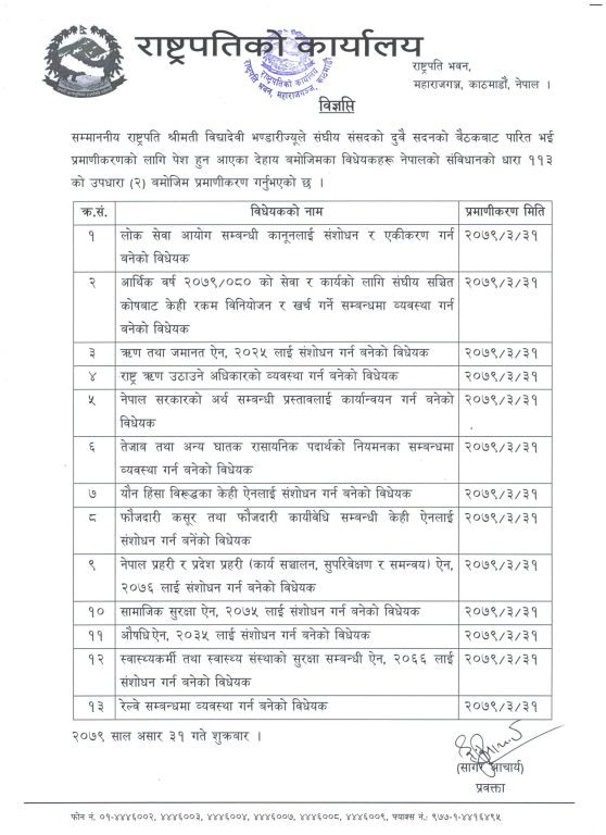 काठमाडौं । राष्ट्रपति विद्यादेवी भण्डारीले १३ विधेयक प्रमाणीकरण गरेकी छन् । राष्ट्रपति कार्यालयले एक सूचना जारी गर्दै संघीय संसद्को दुवै सदनको बैठकबाट पारित भई प्रमाणीकरणका लागि पेस भएका विभिन्न १३ विधेयक राष्ट्रपति भण्डारीले नेपालको संविधानको धारा ११३ को उपधारा ९२० बमोजिम शुक्रवार प्रमाणीकरण गरेको उल्लेख गरेको जनाएको छ ।