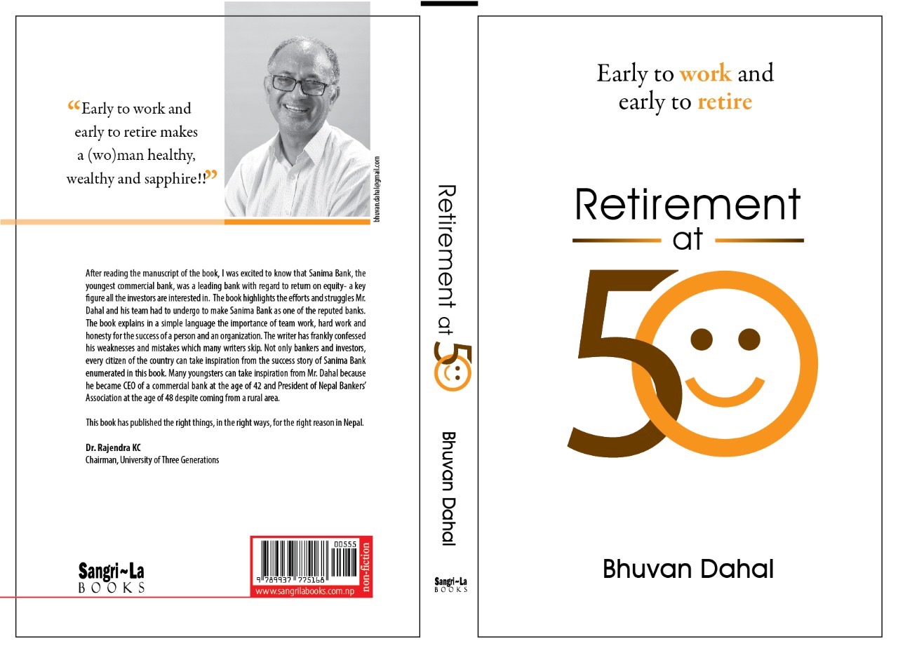काठमाडौं । नेपाल बैंकर संघका पूर्वअध्यक्ष भुवन दाहालको ‘रिटायरमेण्ट एट फिप्टी’ नामक पुस्तक आजबाट बजारमा आएको छ ।