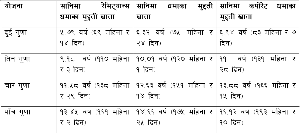 यो योजना बचत खाता, कल खाता तथा सम्पूणर् खाताहरुमा लागू भएको छ । साथै न्यूनतम अवधिमा ५ गुणासम्म हुने व्यक्तिगत तथा संस्थागत सानिमा धमाका मुद्दती खाता ल्याएको छ । मुद्दती निक्षेप रकम परिपक्वता पश्चात् एकमुष्ट ५ गुणासम्म भुक्तानी गरिनेछ । व्यक्तिगत ग्राहकलाई आवश्यक परेमा निक्षेपको ९० प्रतिशतसम्म ऋण, तथा निःशुल्क क्रेडिट कार्डको लिन सक्ने व्यवस्था पनि गरिएको छ ।