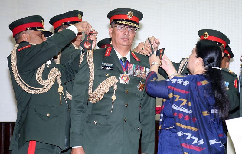आइतबार राष्ट्रपति कार्यालय शितल निवासमा आयोजित दर्ज्यानी चिह्न प्रदान कार्यक्रममा राष्ट्रपति विद्यादेवी भण्डारीले प्रधानसेनापति थापालाई दजर््यानी चिह्न प्रदान गरेकी हुन् । सो कार्यक्रममा उपराष्ट्रपति नन्दबहादुर पुन ‘पासाङ’, प्रधानमन्त्री केपी शर्मा ओली लगायतको सहभागीता थियो ।