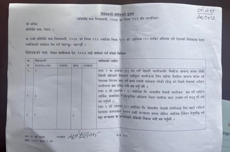 प्रतिनिधि सभा नियमावली २०७५ को नियम १११ बमोजिम विधेयकको दफा ३ को उपदफा १ बमोजिम गैरआवासीय नागरिकता प्राप्त गर्ने व्यक्तिले आर्थिक, सामाजिक र सांस्कृति अधिकार नेपाली नागरिकतासरह उपभोग गर्न पाउने माग गर्दै एमाले सांसद डा. सूर्यप्रसाद पाठकले सोमबार संसदमा संशोधन प्रस्ताव दर्ता गराएका हुन् ।