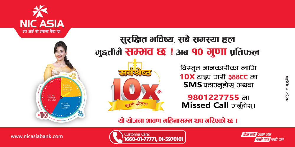काठमाडौं । एनआईसी एसिया बैंकको सर्वश्रेष्ठ १० मुद्दती निक्षेप योजनामा ग्राहकहरुको आर्कषण उच्च देखिएको छ । ग्राहकहरुको आर्कषण उच्च भएसँगै योजनाको अवधि थप गर्र्नुपर्ने माग भएपछि बैंकले उक्त योजनालाई श्रावण महिनासम्मको लागि थप गरेको हो ।