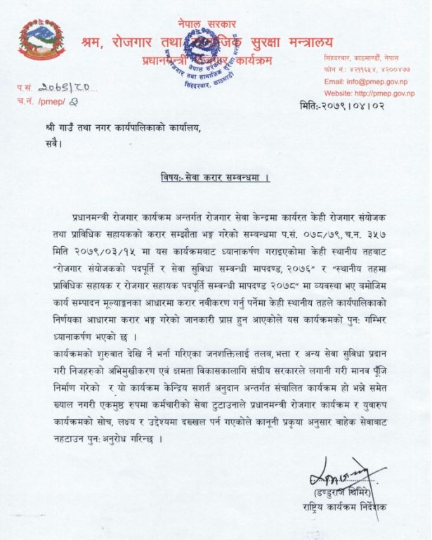 प्रधानमन्त्री रोजगार कार्यक्रमअन्तर्गत रोजगार सेवा केन्द्रमा कार्यरत रोजगार संयोजक र प्राविधिक सहायकको करार सम्झौता पनि स्थानीय तहले भंग गरिदिएपछि प्रधानमन्त्री रोजगार केन्द्रले त्यसो नगर्न भनेको छ ।