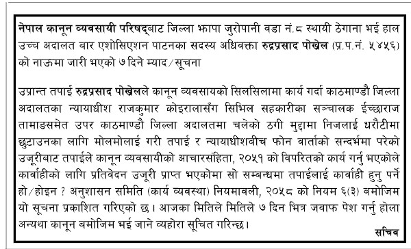 ‘तपाई र कानुन व्यवसायीबीच फोन वार्ताको सन्दर्भमा परेको उजुरीबाट तपाईँले कानुन व्यवसायीको आचारसंहिता, २०५१ को विपरित कार्य गर्नु भएकाले कारबाहीको लागि प्रतिवेदन उजुरी प्राप्त भएकोमा सो सम्बन्धमा तपाईलाई कारबाही हुनुनपर्ने हो/होइन? अनुशासन समिति नियमावली, २०५८ को नियम ६ (३) बमोजिम यो सूचना प्रकाशित गरिएको छ’, सूचनामा भनिएको छ,‘ आजका मितिले सात दिन भित्र जवाफ पेश गर्नुहोला अन्यथा कानून बमोजिम भई जाने व्यहोरा सूचित गरिन्छ ।’