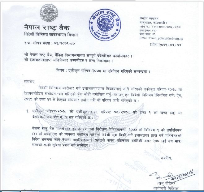 विदेश भ्रमणमा जाने नेपाली नागरिकहरुलाई राहदानी बापत तोकिएबमोजिमको सटही सुविधा प्रदान गर्ने कारोबारका लागि थप दुई लाख रुपैयाँ प्रदान गर्न सकिने छ । राष्ट्र बैंकका अनुसार यसरी राखिने धरौटी रकम नगद वा बैंक तथा वित्तीय संस्थाबाट जारी भएको जमानतको रूपमा समेत राख्न सकिनेछ । बैंक तथा वित्तीय संस्थाबाट जारी भएको जमानतको हकमा सोको अवधि कम्तीमा ४८ महिनाको हुनु पर्नेछ ।