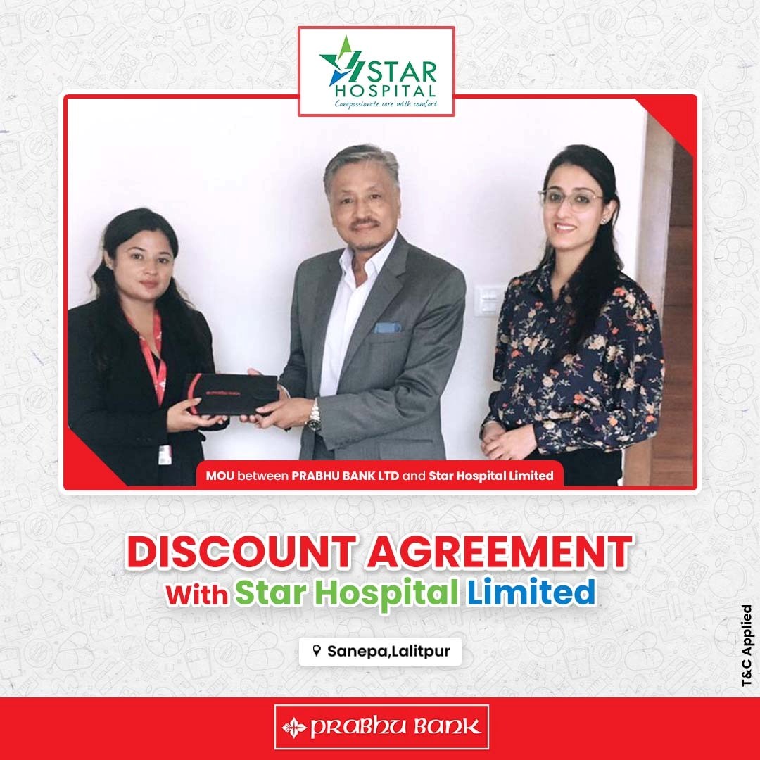 प्रभु बैंक र उक्त हस्पिटलबीच सम्पन्न सम्झौता अनुसार प्रभु बैंकमा खाता खोली बैंकिङ कारोबार गरिरहेका सम्पूर्ण ग्राहकहरुले स्टार हस्पिटल लिद्वारा सञ्चालित सेवा मध्य बेड चार्ज तथा अनुसन्धान सेवामा १० प्रतिशत छुट प्राप्त हुने व्यवस्था गरिएको छ ।