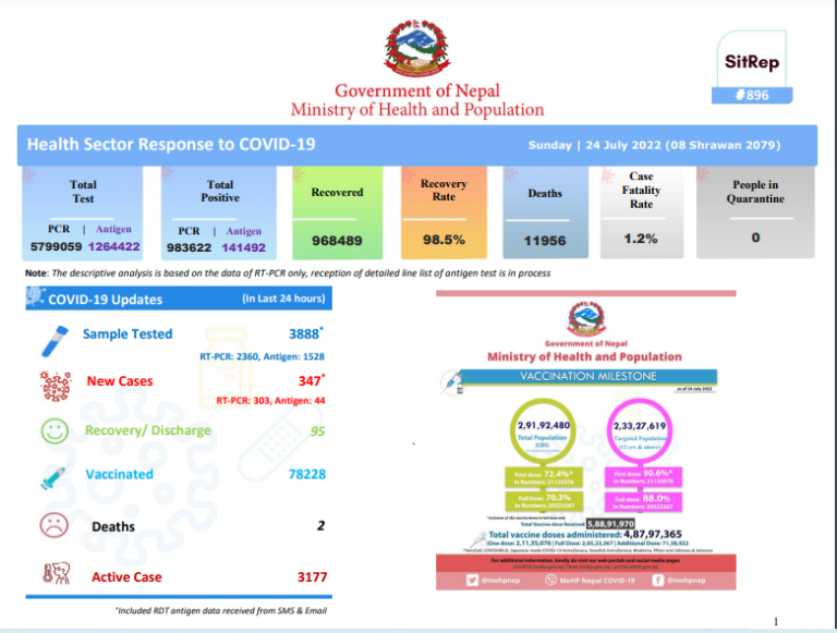 ३ हजार ८ सय ८८ जनाको परीक्षण गर्दा थप ३ सय ४७ जनामा कोरोनाको संक्रमण पुष्टि भएको स्वास्थ्य तथा जनसंख्या मन्त्रालयले जनाएको छ ।