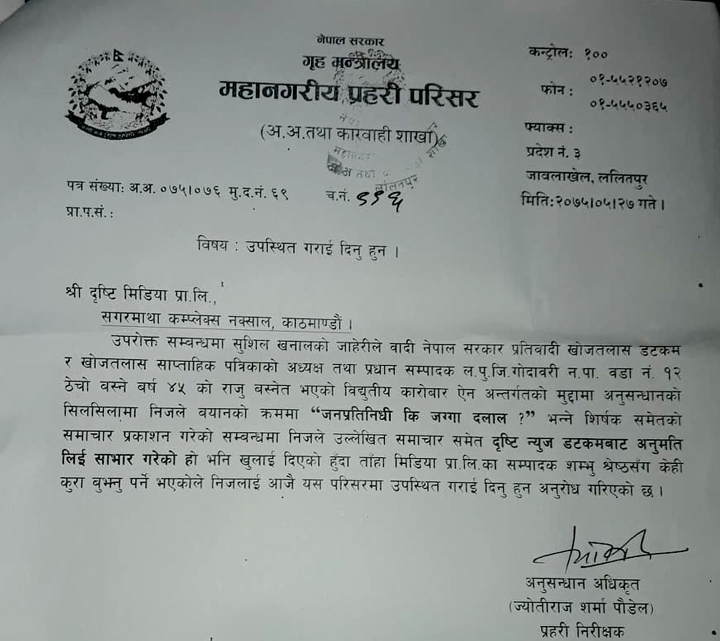 दृष्टिको समाचार साभार गरी अनलाइनमा प्रकाशन गरेको आरोपमा पक्राउ गरिएका खोजतलास साप्ताहिकका प्रधानसम्पादक राजु बस्नेतको बयानका आधारमा प्रहरी परिसरले श्रेष्ठलाई पत्राचार गरी कार्यालयमा बोलाएर बयान लिएको हो ।