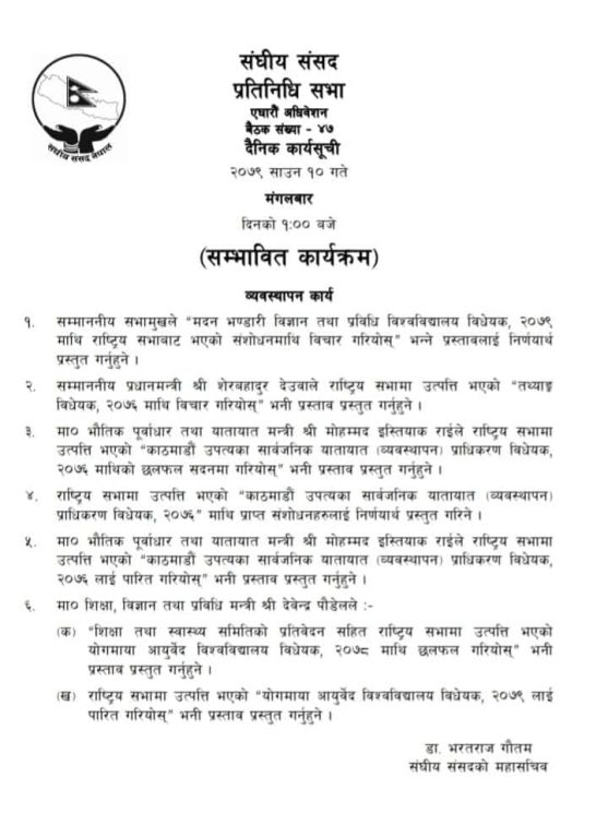 छलफल सकिएपछि यी विधेयक आजै पारित गर्नका लागि प्रस्ताव पेस गर्ने कार्यसूची पनि रहेको संसद सचिवालयद्वारा जारी सम्भावित कार्यसूचीमा उल्लेख छ ।
